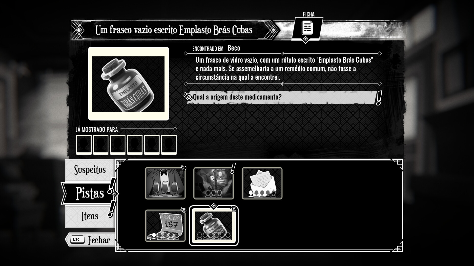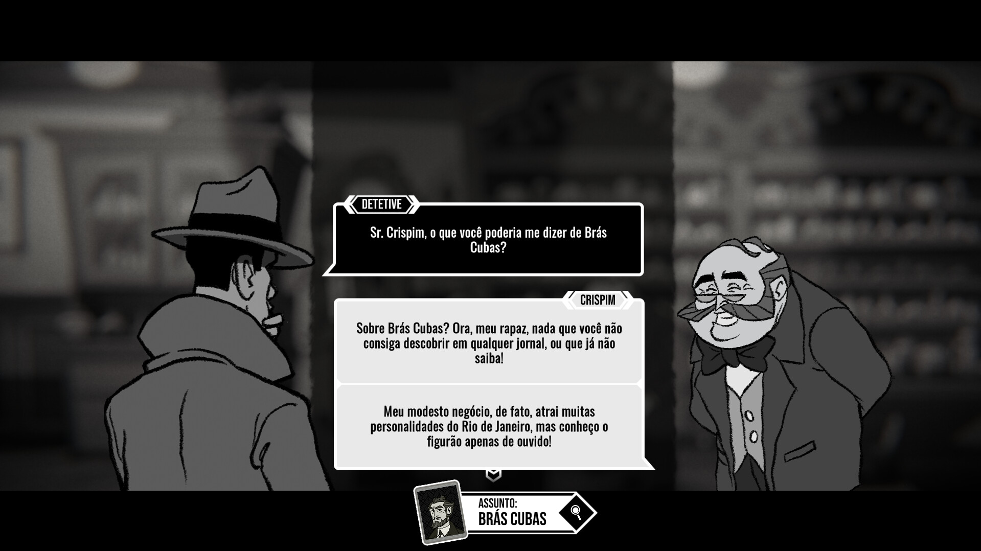 Com a premissa estabelecida, é hora de ir às ruas coletar pistas e conversar com possíveis testemunhas. Você precisa entrar em estabelecimentos comerciais, conversar com policiais, vendedores de jornais e pessoas próximas a Brás Cubas para entender o que aconteceu.
