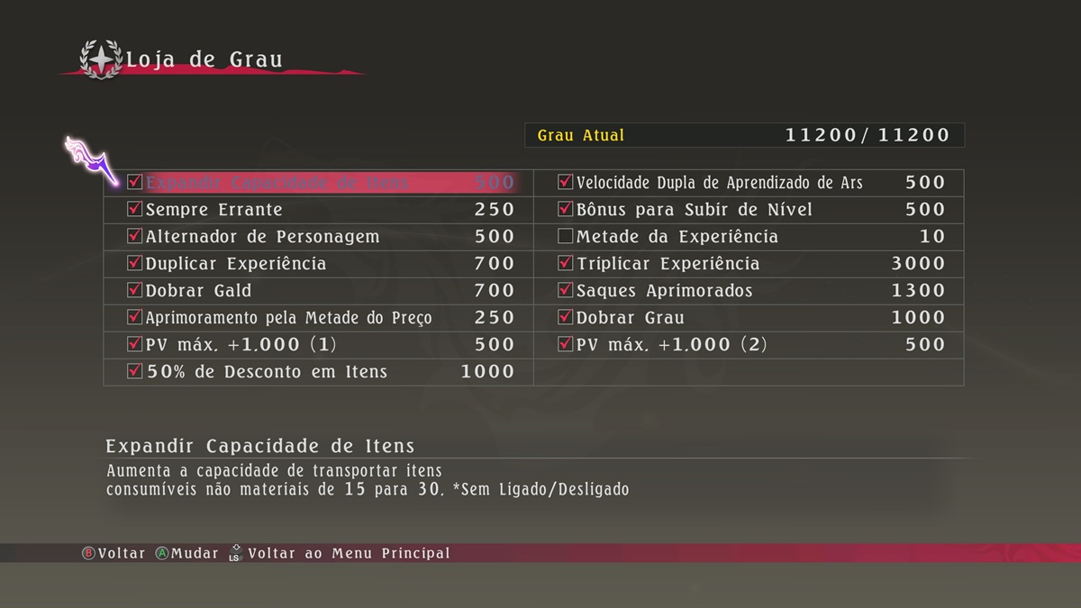 Itens adquiridos podem ser ativados ou desativados em Sistema > Loja de Grau. Itens como transferência de nível não estão disponíveis na primeira jogada. Alguns itens só podem ser alternados ao iniciar o jogo. |
