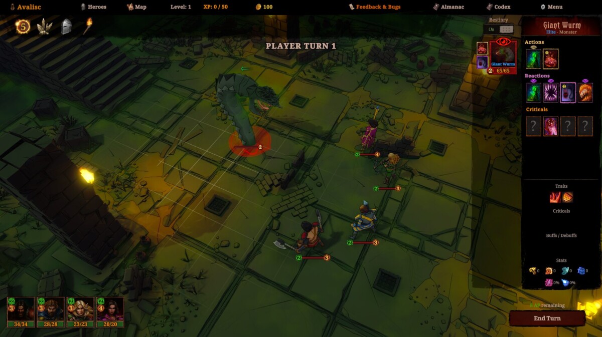 Por exemplo, como todos os inimigos possuem as reações aos ataques, às vezes, a melhor estratégia para um turno é fazer nada (ou só mover os personagens) para deixar as habilidades recarregarem.